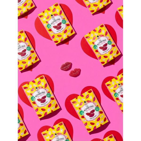 Ces bonbons en forme de bouche au goût de cerise sont réalisés sans colorants artificiels et avec des arômes naturels, vegan (sans gélatine animale mais avec de la pectine de fruits) et bio, sans lactose, sans gluten. Ils sont fabriqués en France.